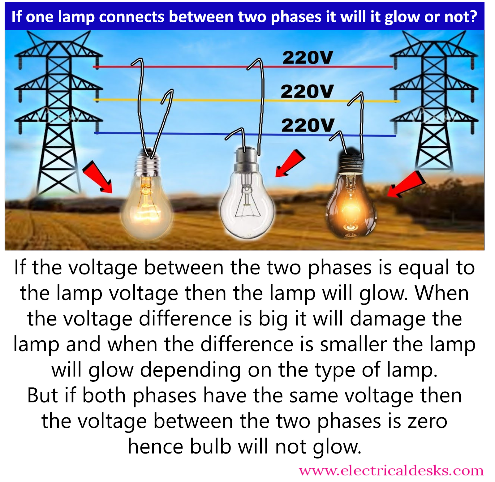It's depending upon the phase difference between those phases in which you connect that lamp. If the phase difference is there, then the lamp is definitely glowing but if the phase difference is zero then the lamb won't glow (provided the magnitude of both phases must be the same). If you connect this lamp to our 3-phase system, then it will definitely glow because there is always a phase difference of 120 degrees and the magnitude is the same in our practical system.